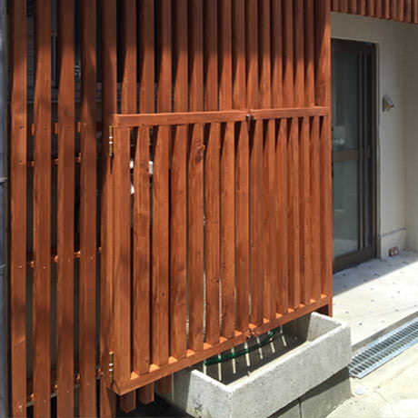 正面に使われている外壁材は、杉板です。昔は当たり前のように日本の家の外壁に使われていた杉板ですが、昨今の都市部における戸建住宅の外壁には、「新建材」とされるアルミサッシやサイディング材が多用されており、 いつのまにかほとんど使われなくなった建材です。アルミサッシやサイディング材は、反りや色むらがなく、経年による寸法の変化も少ない優秀な建材ではありますが、せっかく『和』のテイストを希望されているお客様に、都会に建つ家だからこその「温かみ」をデザインに取り入れたいと考えて、あえて杉板を採用させていただきました。十分に乾燥させた高品質の杉板を使用し、さらに塗料も表面を塗るものではなく、特殊な浸透性の木材保護塗料を施していますので、単なる経年劣化ではなく、年月と共に「熟成」する外壁材として将来を楽しみにしていただけることをコンセプトに施工させていただきました。