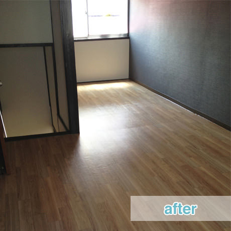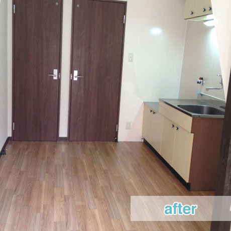 小部屋に分かれていた2DKを広々と見える1LDKに間取り変更し、全室和室から洋室へとリフォーム致しました。予算をできるだけ抑えて費用対効果の高いリフォームを、とのことでしたので、水回りや建具などを中心に予算を配備し、入居者様の顧客満足度を高めることで大学生活のある四年間を快適に入居し続けていただける室内になることを重視したリフォームを致しました。