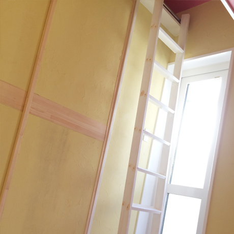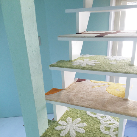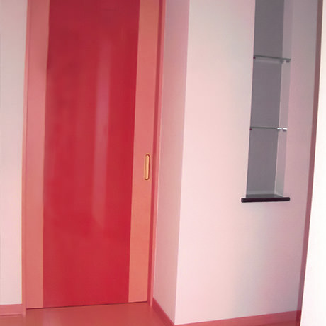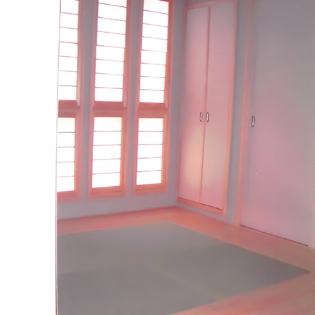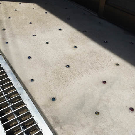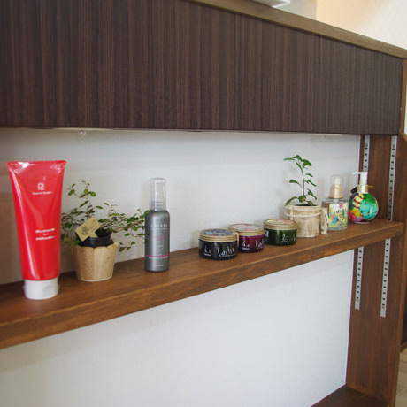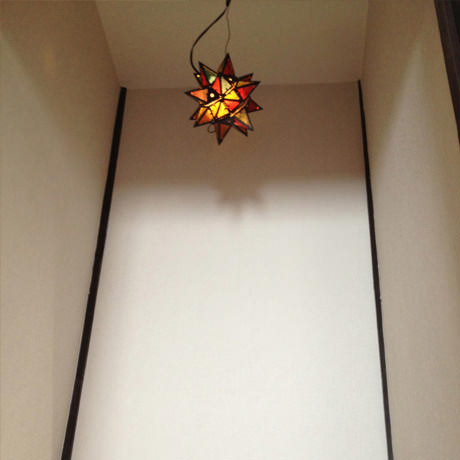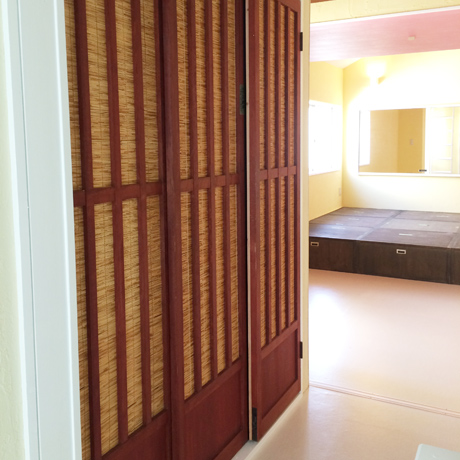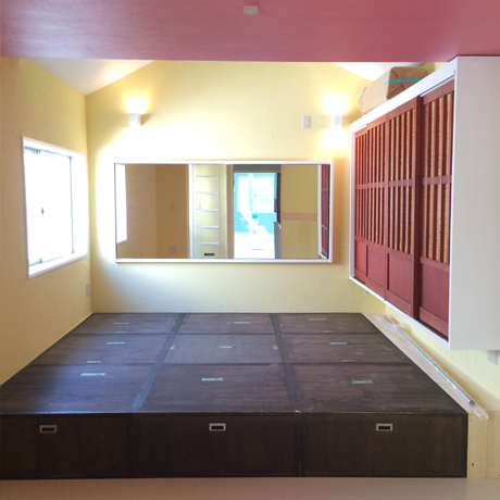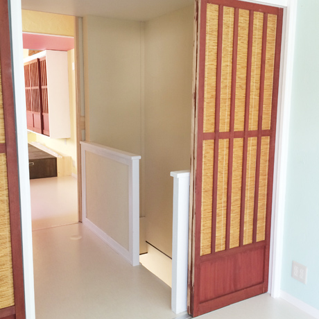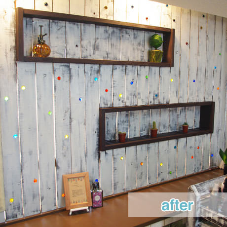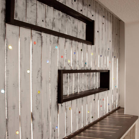 物件の西側壁がすべて大きな窓となっており、西陽が強く入る物件のため、西側の窓を全面杉板張りとし、その隙間から西陽が入り込むことで、夕方の強い太陽光が柔らかな表情になるように致しました。さらに杉板にカラービー玉を埋め込むことで、お天気の日の夕方にはビー玉が美しく光り輝くという遊び心も加えさせていただきました。