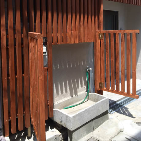 正面に使われている外壁材は、杉板です。昔は当たり前のように日本の家の外壁に使われていた杉板ですが、昨今の都市部における戸建住宅の外壁には、「新建材」とされるアルミサッシやサイディング材が多用されており、 いつのまにかほとんど使われなくなった建材です。アルミサッシやサイディング材は、反りや色むらがなく、経年による寸法の変化も少ない優秀な建材ではありますが、せっかく『和』のテイストを希望されているお客様に、都会に建つ家だからこその「温かみ」をデザインに取り入れたいと考えて、あえて杉板を採用させていただきました。十分に乾燥させた高品質の杉板を使用し、さらに塗料も表面を塗るものではなく、特殊な浸透性の木材保護塗料を施していますので、単なる経年劣化ではなく、年月と共に「熟成」する外壁材として将来を楽しみにしていただけることをコンセプトに施工させていただきました。