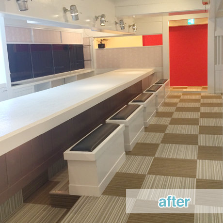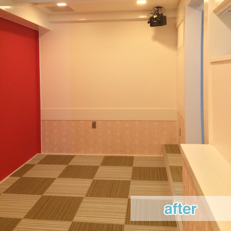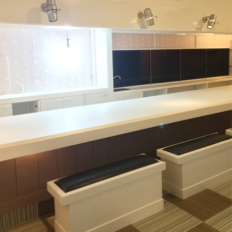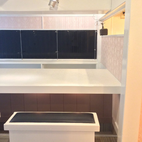 心斎橋において、新規で開店する店舗の内装をご依頼いただきました。和風の居酒屋を居抜きでご契約された物件でしたが、施主様より、「女性が喜ぶような可愛いらしいデザインで、窓のない空間ということを意識させないような明るさを感じさせて欲しい。予算は抑えたいので、既存の残置物に関してはリメイクして使えるものはすべて使って欲しい」とのご注文をいただきましたので、カウンターは既存のものに奥行きを加えることで高級感を演出しつつ、椅子等はリメイクすることで再利用いたしました。早くお店をオープンしたいということですので、予算に収まる範囲で、できるだけ短い工期の対応をさせていただきました。